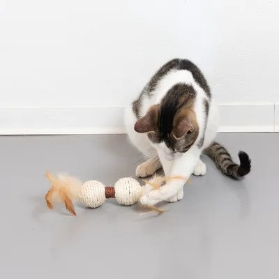 Vzrušující hračka pro kočky ve tvaru činky s chrastítkem pro stimulující akustiku hry, obalená sisalem pro škrábání a kopání. S pravým peřím podporuje hravé lovecké chování, velikost: cca 34 cm