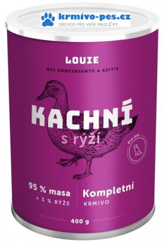 Masová konzerva pro psy Louie s obsahem 95% jemně namletého masa a s 5% rýže bez přidané želatiny, konzervantů, dochucovadel, barviv či stabilizátorů.