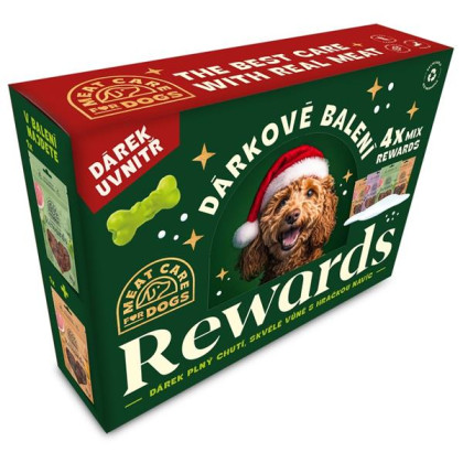 Dárkové balení Rewards obsahuje v recyklovatelném boxu čtveřici sáčků s voňavými pamlsky a jako bonus odolnou hračku z TPR materiálu, kterou lze naplnit dobrotami.