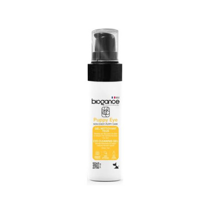 Gel Biogance Puppy Eye k jemnému čištění očního okolí štěňat s obsahem zeleného čaje a aloe vera pomáhá redukovat hnědé skvrny. S mandlovou vůní, neutrálním pH a bez obsahu parabenů.