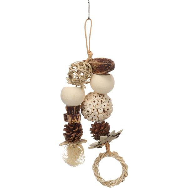 Přírodní závěsná hračka z mahagonového lusku, ratanu, šišek, dřeva sola, borového dřeva, lufy a palmových listů je vhodná pro různé druhy papoušků. Podporuje mentální aktivitu a přirozenou péči o zobák. Díky kovovému závěsnému systému ji lze snadno upevnit do klece nebo voliéry. Součástí hračky jsou korálky, míček, šišky, mahagonový lusk, hvězdičky, kroužek a lufa, které vybízejí k ozobávání. Použité materiály jsou přírodní a bezpečné pro papoušky.