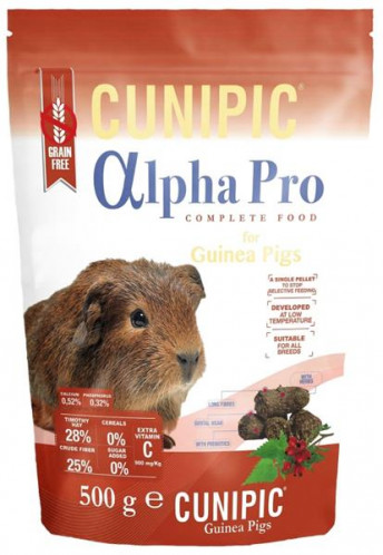 Cunipic Alpha Pro Guinea Pig – morče. Kompletní krmivo bez obsahu obilovin. Zdravá, velice chutná a vyvážená receptura pro morčata. Každá granule obsahuje všechny nezbytné suroviny a vitamíny pro zdraví morčete bez výkyvů v příjmu živin. Krmivo s vysokým obsahem vlákniny (25 %), bez přidaných barviv a cukrů vhodné pro všechna plemena.