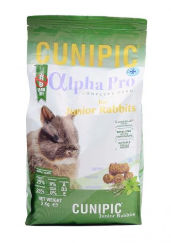 Cunipic Alpha Pro Junior Rabbit – mladý králík. Kompletní krmivo bez obsahu obilovin. Zdravá, velice chutná a vyvážená receptura pro mladé králíky (do 6 měsíců věku). Každá granule obsahuje všechny nezbytné suroviny a vitamíny pro zdraví králíka bez výkyvů v příjmu živin. Krmivo s vysokým obsahem vlákniny (23 %), bez přidaných barviv a cukrů vhodné pro všechna plemena.