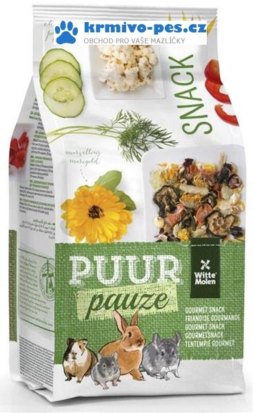 PUUR pauze snack muesli je lahůdková pochoutková doplňková směs se zeleninou a bylinkami pro chutné mlsání králíků, morčat, činčil, osmáků a dalších drobných savců.