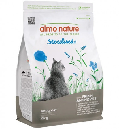 Sterilised je funkční suché krmivo pro dospělé kočky. Kastrovaní jedinci mají vyšší riziko nabrání váhy a rozvoje onemocnění močového traktu. Vysoký obsah čerstvého masa nebo čerstvých ryb zvyšuje chutnost a stravitelnost krmiva. Nízký obsah hořčíku činí z receptury Sterilized optimální výživu pro všechny kočky, včetně kastrovaných jedinců. Ideální je v kombinaci s vlhkým krmivem Almo Nature Sterilised.
