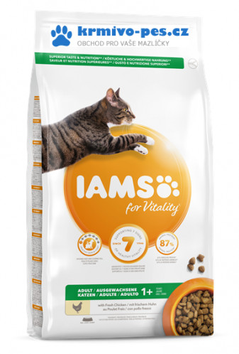 Krmivo IAMS for Vitality pro dospělé kočky s čerstvým kuřecím masem je 100% kompletní a vyvážené, odborníky sestavené krmivo, které podporuje sedm znaků zdravé vitality kočky a zajistí jí zdravou kůži a lesklou srst. Veškeré živiny jsou obsažené v lahodné receptuře s 87% obsahem živočišných bílkovin (z celkového obsahu bílkovin). Umožněte svému mazlíčkovi užívat si každý den naplno!