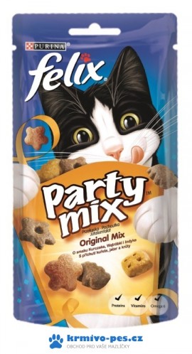 Purina® Felix® Party Mix Original Mix - doplňkové krmivo pro dospělé kočky s příchutí kuřete, jater a krůty.