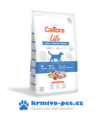 Granule Calibra Life pro dospělé psy středních plemen. Kompletní suché krmivo s kuřecím masem pro optimální stav zažívacího ústrojí a na podporu aktivního stylu života